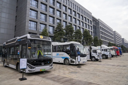 在“成渝氢走廊”启动暨氢燃料电池物流车首发仪式上,展示搭载东方电气氢燃料电池的商用车,包括公交车、物流车、工程专用车等。