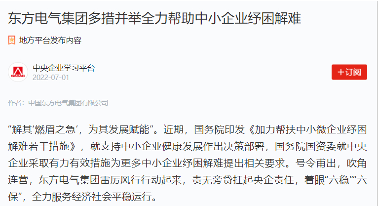 “解其‘燃眉之急’,为其发展赋能”。近期,国务院印发《加力帮扶中小微企业纾困解难若干措施》,就支持中小企业健康发展作出决策部署,国务院国资委就中央企业采取有力有效措施为更多中小企业纾困解难提出相关要求。号令甫出,吹角连营,东方电气集团雷厉风行行动起来,责无旁贷扛起央企责任,着眼“六稳”“六保”,全力服务经济社会平稳运行。