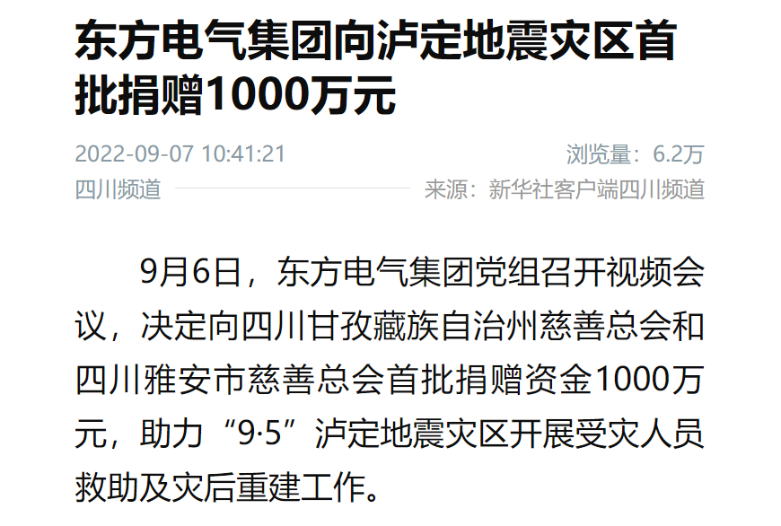 9月6日,东方电气集团党组召开视频会议,决定向四川甘孜藏族自治州慈善总会和四川雅安市慈善总会首批捐赠资金1000万元,助力“9·5”泸定地震灾区开展受灾人员救助及灾后重建工作。