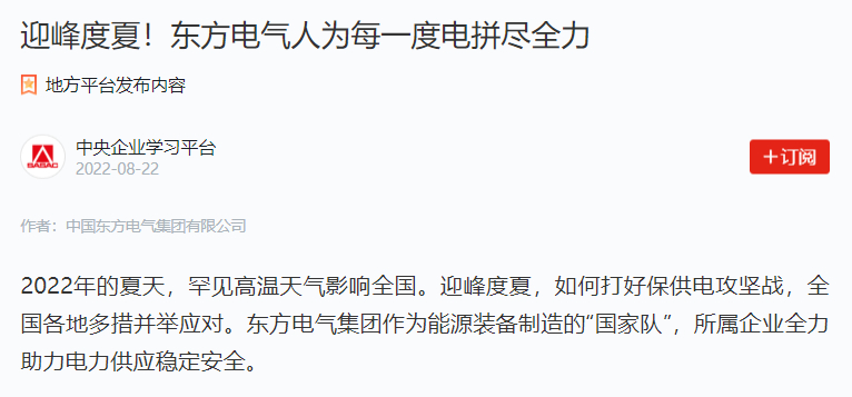 2022年的夏天,罕见高温天气影响全国。迎峰度夏,如何打好保供电攻坚战,全国各地多措并举应对。东方电气集团作为能源装备制造的“国家队”,所属企业全力助力电力供应稳定安全。