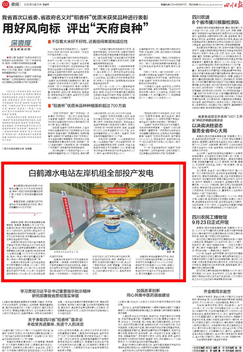本报讯(孙恺 四川日报全媒体记者李欣忆 张彧希 曹凘源)9月22日下午,白鹤滩水电站8号机组顺利通过并网调试72小时试运行,正式转入商业运行,这是白鹤滩水电站投产发电的第12台百万千瓦水轮发电机组,标志着白鹤滩水电站左岸机组全部投产发电。