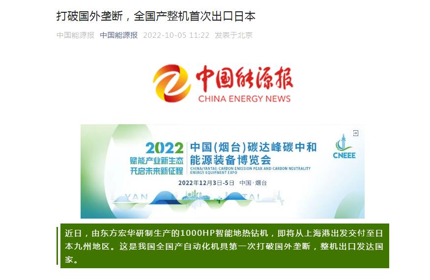 本次验收的日本1000HP智能地热钻机搭载东方宏华自主研发的全套自动化机具,这是我国全国产自动化机具第一次打破国外垄断、整机出口发达国家,标志着我国钻机自动化控制水平得到国际高端市场认可。