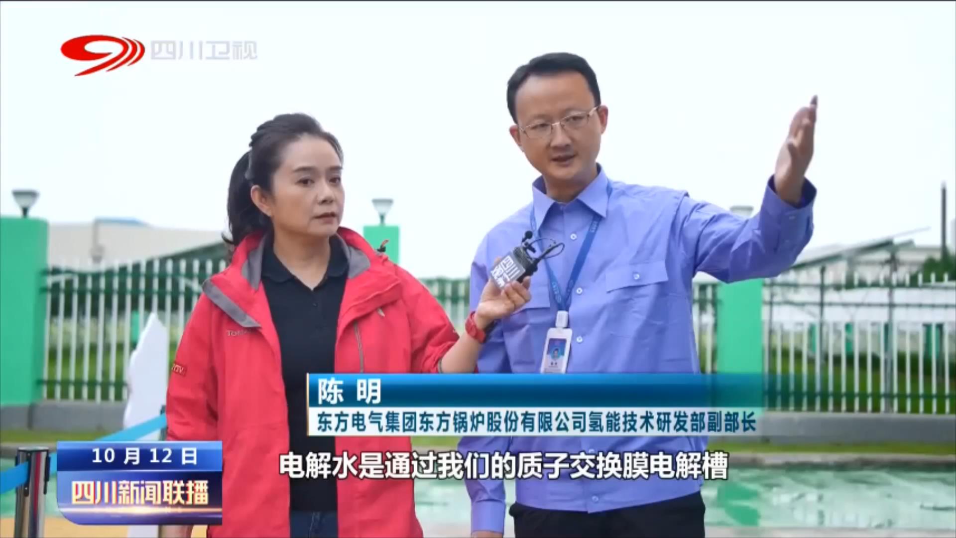 东方电气集团东方锅炉股份有限公司氢能技术研发部副部长 陈明:这是我们的质子交换膜电解水制氢系统。电解水是通过我们的质子交换膜电解槽,把我们的电能转换为氢气和氧气,供我们后续场景使用。这是我们的储氢系统 。