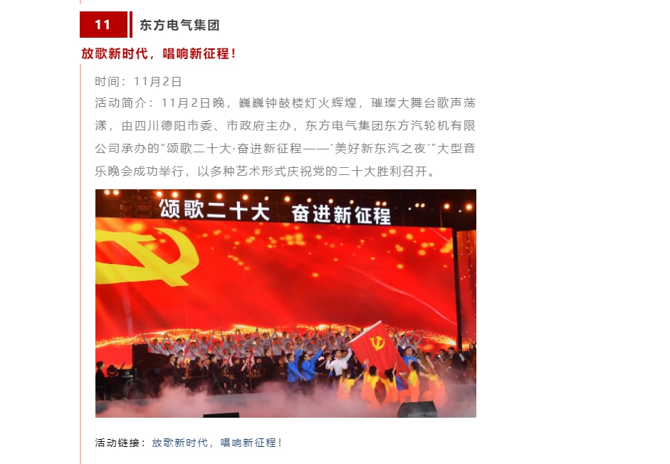 活动简介:11月2日晚,巍巍钟鼓楼灯火辉煌,璀璨大舞台歌声荡漾,由四川德阳市委、市政府主办,东方电气集团东方汽轮机有限公司承办的“颂歌二十大·奋进新征程——‘美好新东汽之夜’”大型音乐晚会成功举行,以多种艺术形式庆祝党的二十大胜利召开。