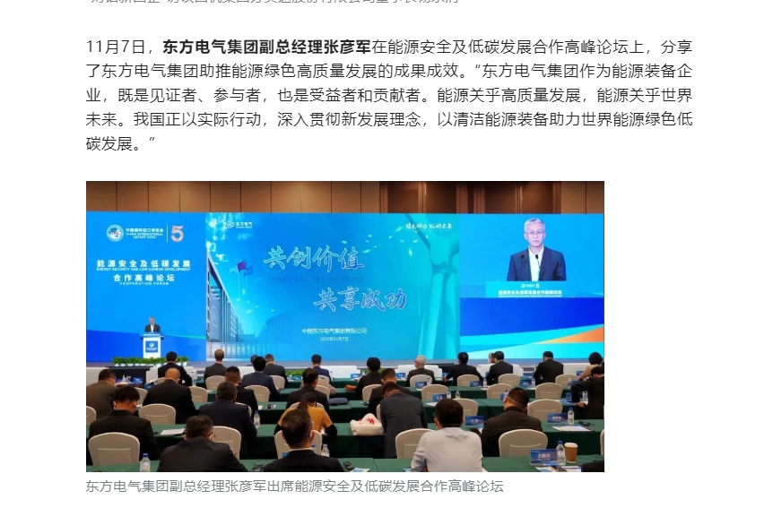 11月7日,东方电气集团副总经理张彦军在能源安全及低碳发展合作高峰论坛上,分享了东方电气集团助推能源绿色高质量发展的成果成效。“东方电气集团作为能源装备企业,既是见证者、参与者,也是受益者和贡献者。能源关乎高质量发展,能源关乎世界未来。我国正以实际行动,深入贯彻新发展理念,以清洁能源装备助力世界能源绿色低碳发展。”