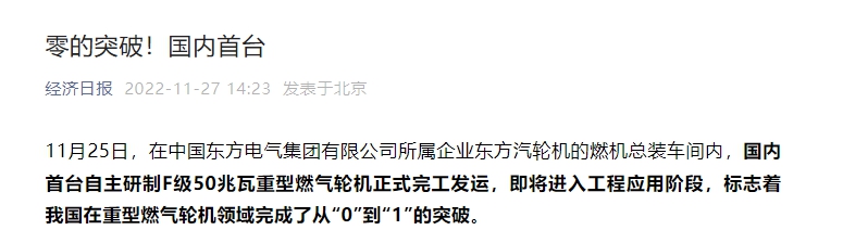 相较于同功率的火力发电机组,东方电气F级50兆瓦重型燃气轮机一年可减少碳排放超过50万吨,联合循环一小时发电量超过七万千瓦时,可以满足7000个家庭1天的用电需求,将积极助推“双碳”目标实现。