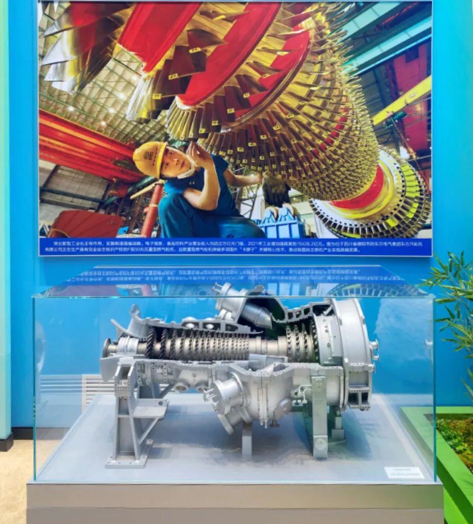 在党的二十大胜利召开之际,东方电气集团自主研制的国内首台50兆瓦重型燃机部件图片和实物模型在“奋进新时代”主题成就展展出