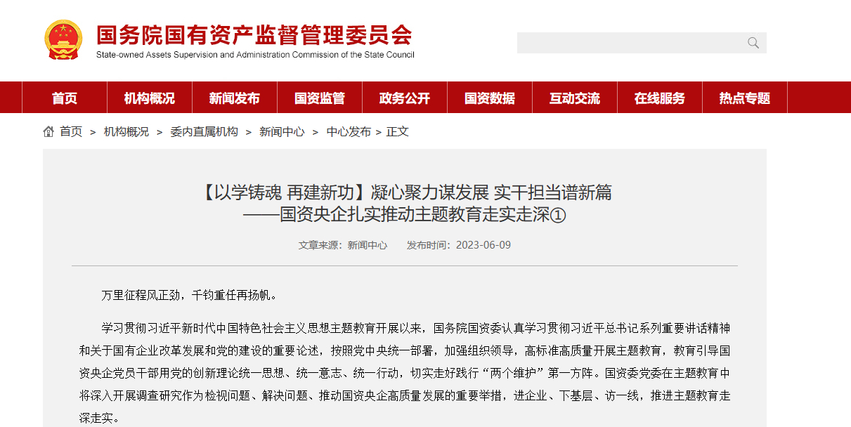 [国资委网站]凝心聚力谋发展 实干担当谱新篇 ——国资央企扎实推动主题教育走实走深