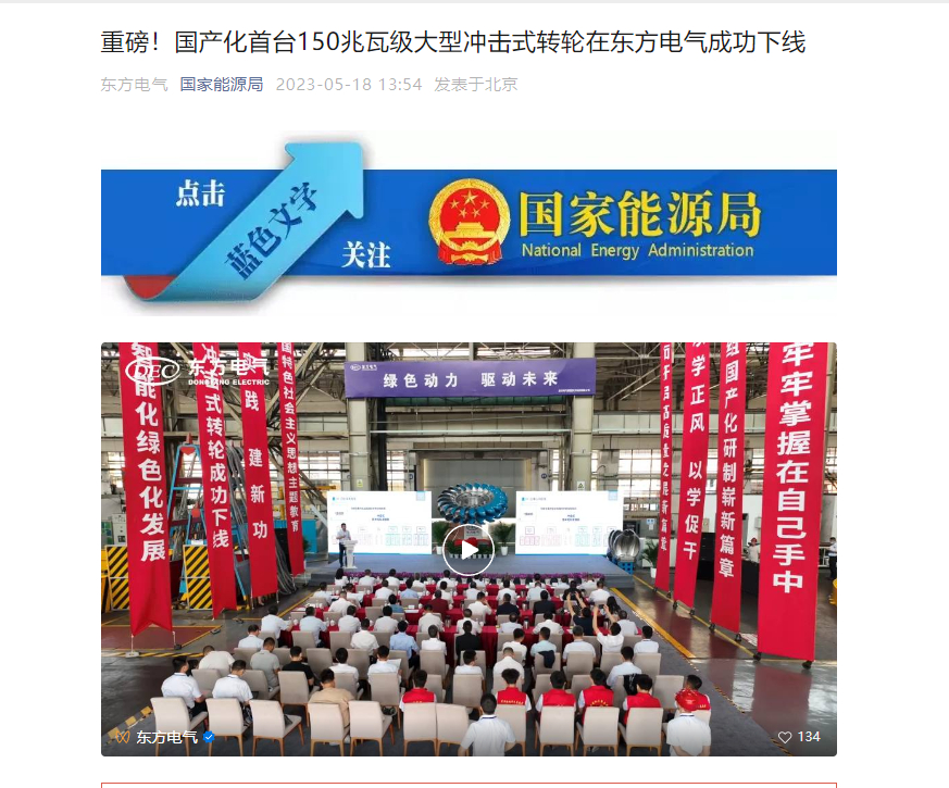 5月16日,东方电气自主研制的国内首台单机容量最大功率150兆瓦级大型冲击式转轮成功下线,实现了我国高水头大容量冲击式水电机组关键核心技术国产化“从无到有”的历史性突破,将为国内单机容量最大的冲击式水电机组装上“中国心”,开启我国水力发电产业高质量发展的崭新篇章。