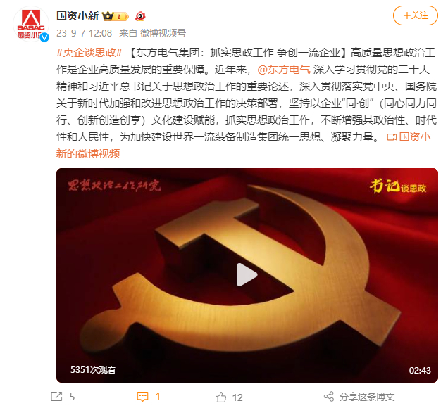 [国资小新]#央企谈思政# 东方电气集团:抓实思政工作 争创一流企业