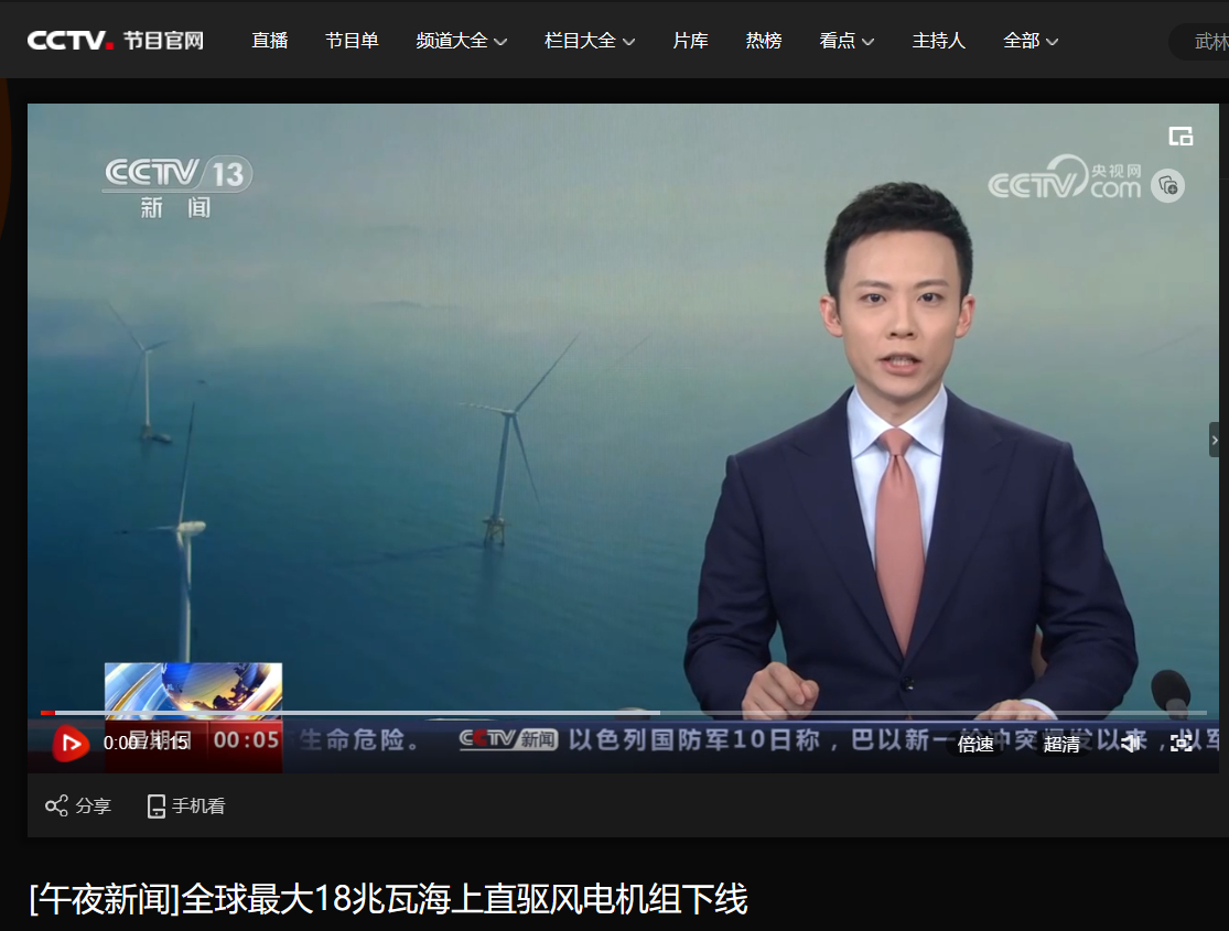 [央视午夜新闻]全球最大18兆瓦海上直驱风电机组下线