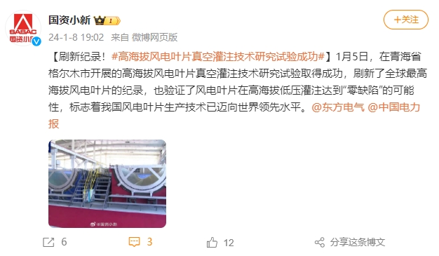 【刷新纪录!#高海拔风电叶片真空灌注技术研究试验成功#】1月5日,在青海省格尔木市开展的高海拔风电叶片真空灌注技术研究试验取得成功,刷新了全球最高海拔风电叶片的纪录,也验证了风电叶片在高海拔低压灌注达到“零缺陷”的可能性,标志着我国风电叶片生产技术已迈向世界领先水平。@东方电气@中国电力报