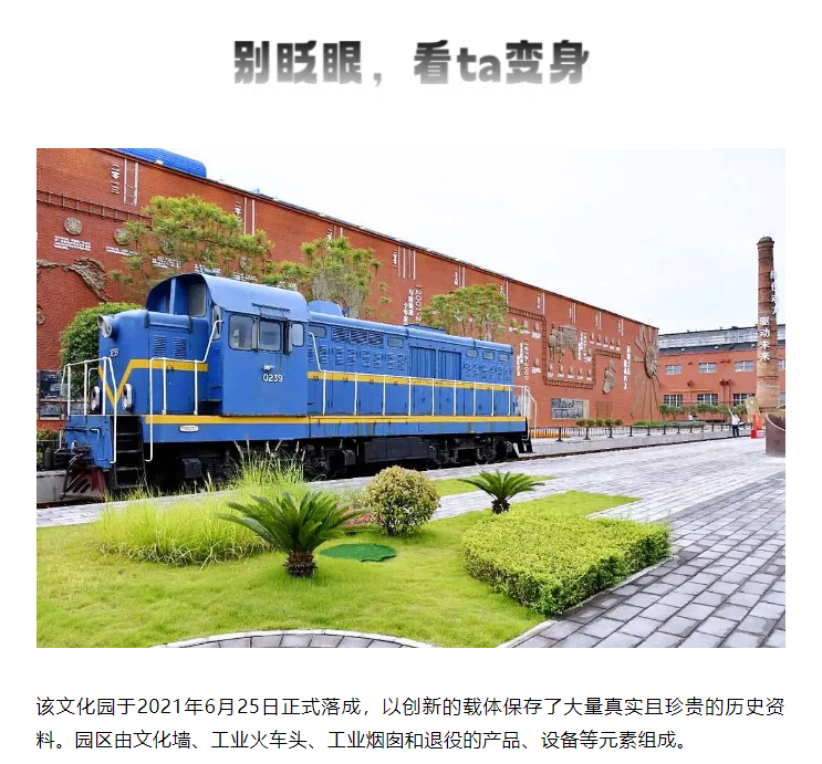 该文化园于2021年6月25日正式落成,以创新的载体保存了大量真实且珍贵的历史资料。园区由文化墙、工业火车头、工业烟囱和退役的产品、设备等元素组成。