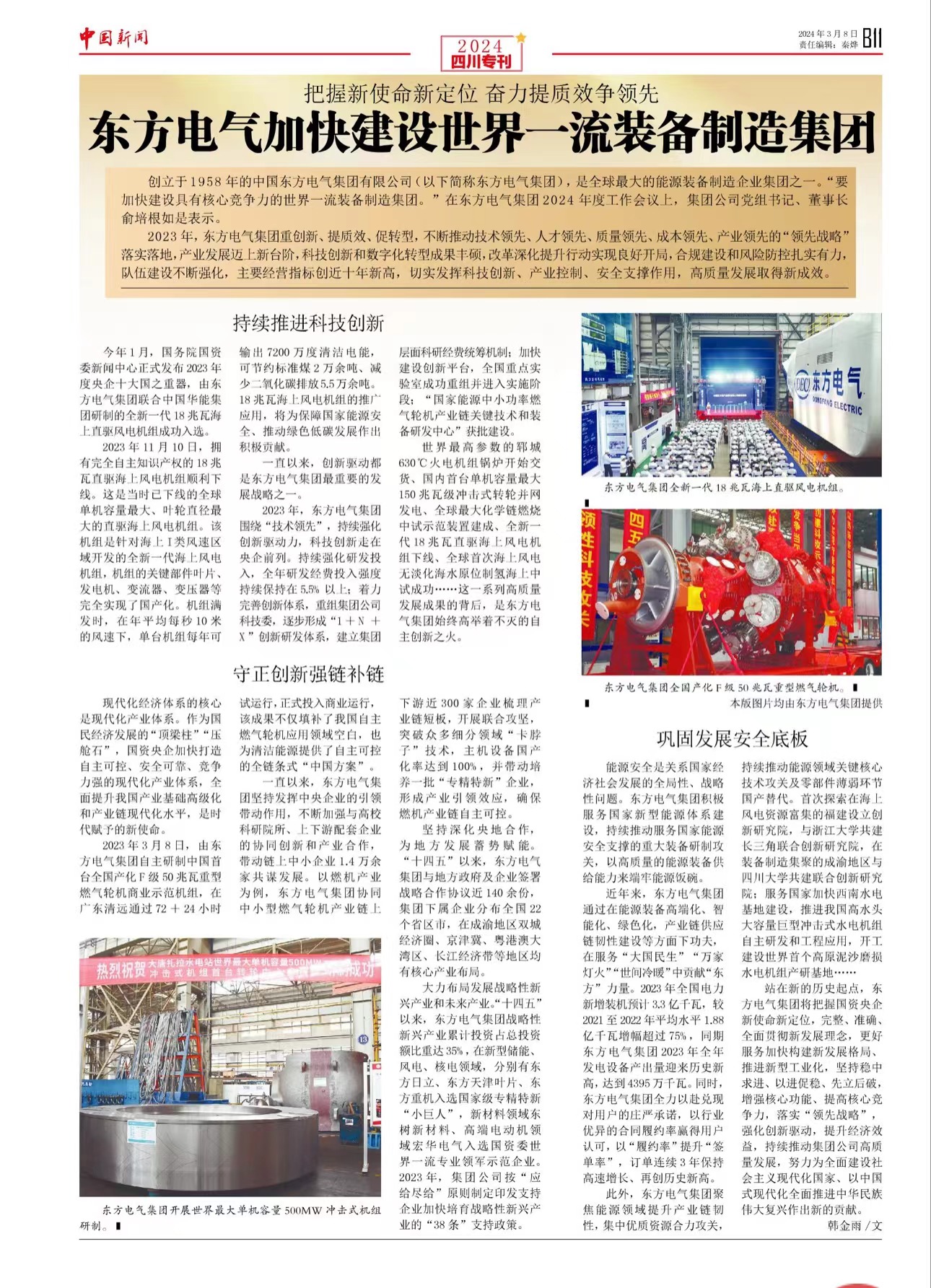 [中国新闻报]把握新使命新定位 奋力提质效争领先 东方电气加快建设世界一流装备制造集团