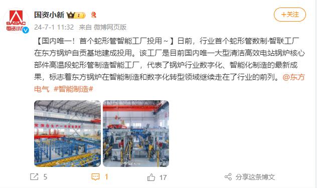 [国资报告]东方锅炉行业首个蛇形管“数制·智联工厂”正式投产