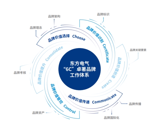 “6C”卓著品牌工作体系立足高端装备制造行业实际,以实现“品牌卓著”为目标,聚焦东方电气品牌价值,由品牌价值选择(Choose)、品牌价值识别(Certificate)、品牌价值创造(Create)、品牌价值传递(Communicate)、品牌价值管控(Control)、品牌价值提升(Consolidate)六个部分组成,阐述展示企业从品牌价值选择到识别、创造、传递、管控,推进价值提升的螺旋进阶的逻辑过程,致力为“中国产品”向“中国品牌”跃升提供系统解决方案。