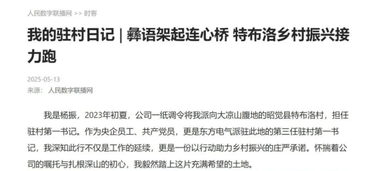 我是杨振,2023年初夏,公司一纸调令将我派向大凉山腹地的昭觉县特布洛村,担任驻村第一书记。作为共产党员、央企员工,更是东方电气集团派驻此地的第三任驻村第一书记,我深知此行不仅是工作的延续,更是一份以行动助力乡村振兴的庄严承诺。怀揣着公司的嘱托与扎根深山的初心,我毅然踏上这片充满希望的土地。