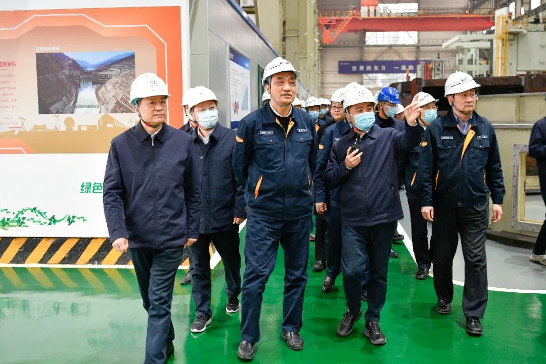 董保同一行先后走访了东方电机大型清洁能源装备重型制造数字化车间、特电新车间、东方法马通主泵生产车间、东方汽轮机控制棒驱动机构生产车间和叶片加工无人车间,深入了解了企业核安全设备生产和智能制造推进情况。