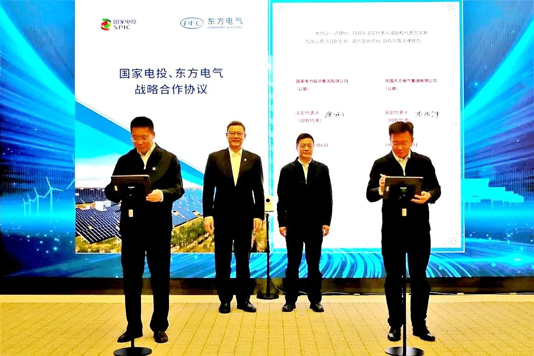 在东方电气集团党组书记、董事长俞培根,国家电投党组书记、董事长钱智民的见证下,东方电气集团党组成员、副总经理李忠军,国家电投党组成员、副总经理徐树彪分别代表双方签字。