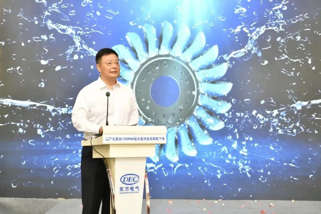 俞培根代表东方电气集团向出席本次活动的领导专家表示热烈的欢迎,对大家长期以来对东方电气集团的关心、支持与帮助表示衷心的感谢,向参与150兆瓦级冲击式转轮国产化研制的全体人员表示热烈的祝贺。他表示,东方电气集团始终秉持产业报国初心和制造强国使命,把科技自立自强作为发展的战略支撑,用实际行动“把关键核心技术牢牢掌握在自己手中”。本次完工下线的国产化首台150兆瓦级冲击式转轮是东方电气集团深入践行国家“双碳”战略、瞄准国内空白和世界一流开展关键核心技术攻关、推动我国能源装备自立自强的具体实践。东方电气集团将持续坚持服务国家战略,与相关单位、创新联合体深入合作,按照既定的“三步走”战略,全力推进巨型冲击式水电机组关键核心技术攻关,不断提高我国能源装备行业核心竞争力,为加快建设科技强国 ,更好服务“双碳”目标作出新的更大贡献。