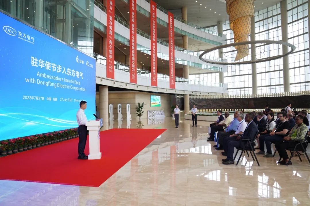 本网讯 在第31届世界大学生夏季运动会即将开幕之际,7月27日,博茨瓦纳驻华大使巴特朗·塞雷马、斐济驻华大使马纳萨·坦吉萨金鲍等13个国家共25名使节代表步入东方电气集团,受到党组书记、董事长俞培根,党组成员、副总经理张彦军的热情接待。