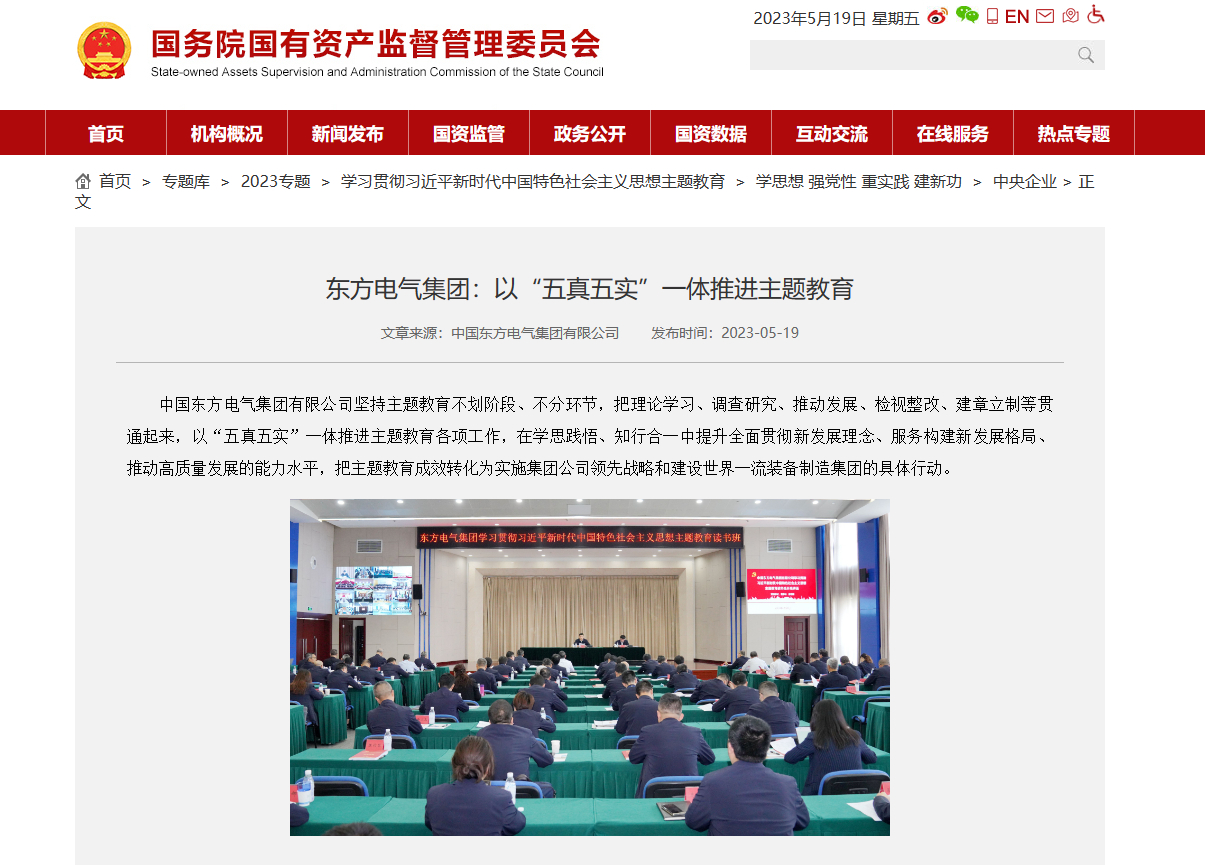 东方电气集团将紧紧锚定主题教育的目标任务,以实干实绩诠释对“两个确立”的忠诚拥护、“两个维护”的坚定践行,以加快建设世界一流装备制造集团新成效,为全面建设社会主义现代化国家、全面推进中华民族伟大复兴做出新的更大贡献。