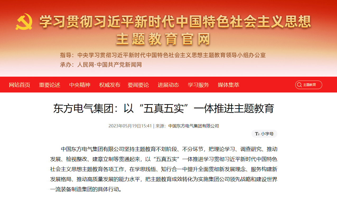 东方电气集团将紧紧锚定主题教育的目标任务,以实干实绩诠释对“两个确立”的忠诚拥护、“两个维护”的坚定践行,以加快建设世界一流装备制造集团新成效,为全面建设社会主义现代化国家、全面推进中华民族伟大复兴做出新的更大贡献。