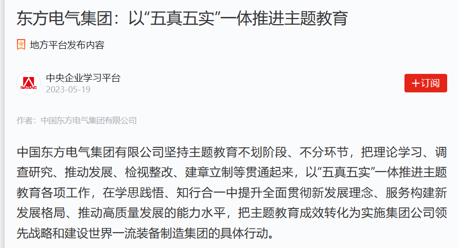 东方电气集团在常态化抓好党员领导干部个人自学基础上,持续推进“以讲领学”“以考促学”“以研深学”“以联共学”“以效验学”的“五学”模式,组织开展好主题教育专题读书班、理论学习中心组专题研讨、网络专题学习培训,通过“线上+线下”“自学+培训”等方式切实加强学习实效。近日,东方电气集团学习贯彻习近平新时代中国特色社会主义思想主题教育读书班正式开班,读书班由专题辅导报告、集中学习研讨、专题研修和红色研学等课程构成,以高质量读书班推动主题教育走深走实。