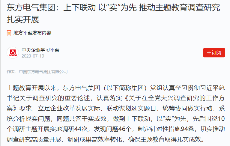 东方电气集团坚持上下联动、以“实”为先、以学促干,今年1-6月,集团营业收入和利润总额均实现两位数以上增长,取得了自主研制的国内首台单机容量最大功率150兆瓦级大型冲击式水电机组转轮成功下线、全球首次海上风电无淡化海水原位直接电解制氢技术海上中试成功等一批重大创新成果。下一步,集团将持续加强调查研究工作,做好问题检视整改,抓好调研成果运用转化,不断破解前进道路上的矛盾和问题,为企业高质量发展、创建世界一流企业保驾护航。