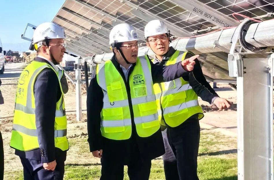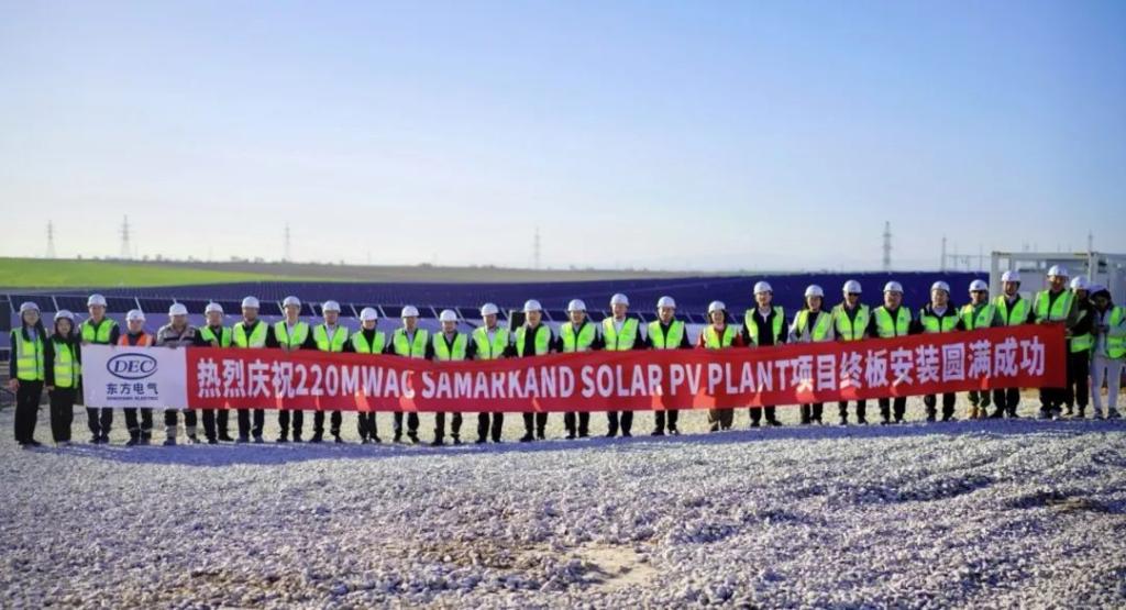 本网讯 3月30日,由东方电气集团所属企业东方国际总承包的乌兹别克斯坦撒马尔罕光伏项目举行最终光伏板安装仪式。四川省副省长左永祥,东方电气集团党组成员、副总经理李忠军出席终板安装仪式。