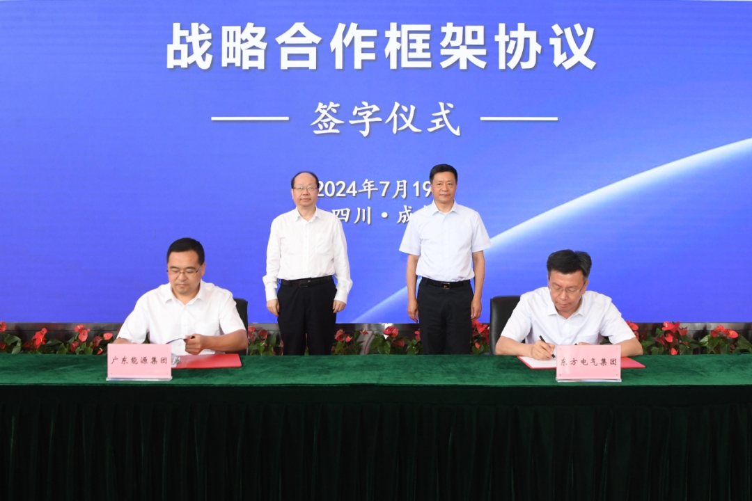 7月19日,东方电气集团党组书记、董事长俞培根与广东能源集团党委书记、董事长张帆在集团总部举行会谈,并见证双方签署战略合作框架协议。东方电气集团党组成员、副总经理李忠军,广东能源集团党委委员、副总经理刘宁宁代表双方签字。