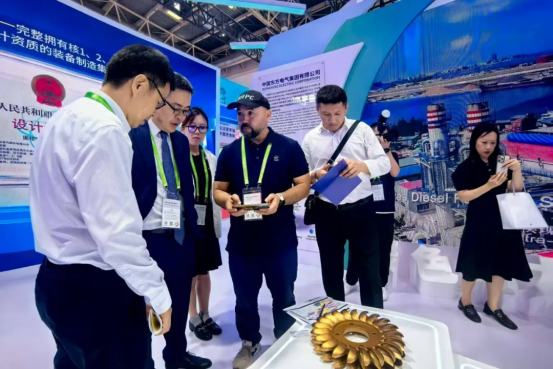 在东方电气集团展台,自主研制的G50燃机、高端水电转轮、26兆瓦级海上风电机组、12000米特深井智能钻机、海水制氢平台“东福一号”、300千瓦组串式光伏逆变器、氢能燃料电池等创新链产品模型集中亮相,吸引了众多专业观众驻足参观。